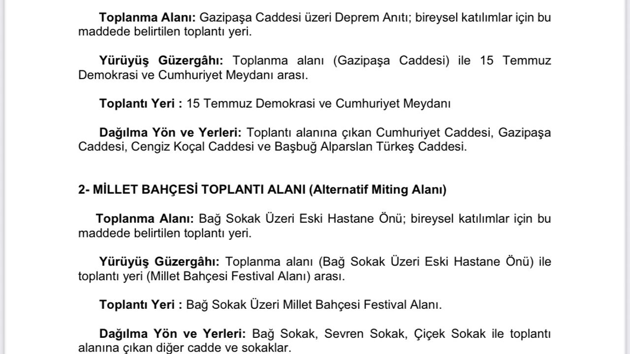 Toplantı ve gösteriler için ana alan olarak belirlenen 15 Temmuz Demokrasi ve Cumhuriyet Meydanı’nda, bireysel katılımlar Gazipaşa Caddesi üzerindeki Deprem Anıtı önünde başlayacak. Yürüyüşler, Gazipaşa Caddesi’nden meydan alanına ulaşacak. Toplantı sonrası dağılmalar ise Cumhuriyet Caddesi, Gazipaşa Caddesi, Cengiz Koçal Caddesi ve Başbuğ Alparslan Türkeş Caddesi üzerinden sağlanacak.